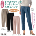 ウエストは総ゴム、タックとギャザーを入れてゆったり仕上げた楽々パンツです。裾に向かって細く設計しているので、足さばきが良く下半身のラインがすっきり、気になる大人体型のお悩みをカバーします。着心地快適なのにすっきりキレイに見えると人気です。